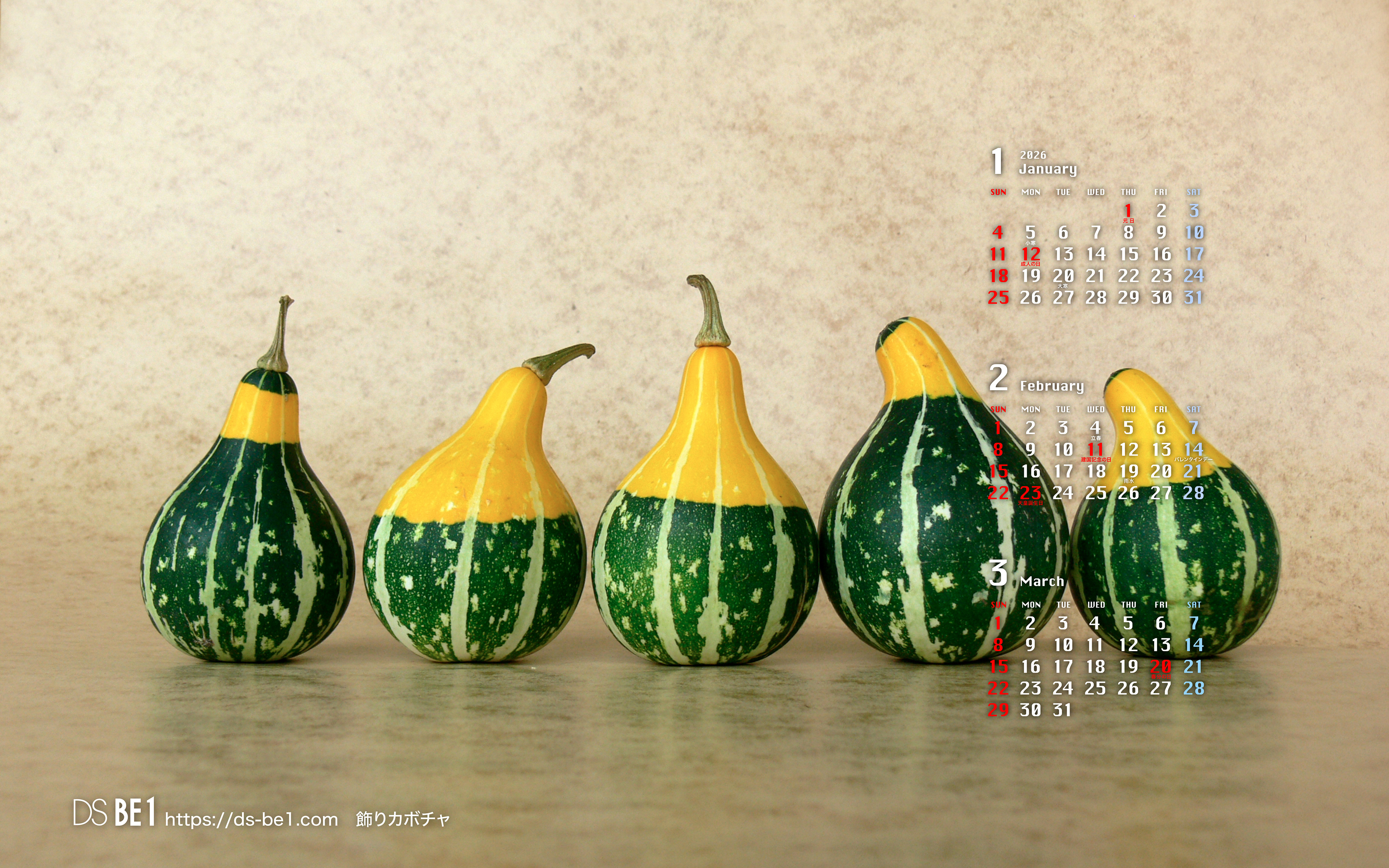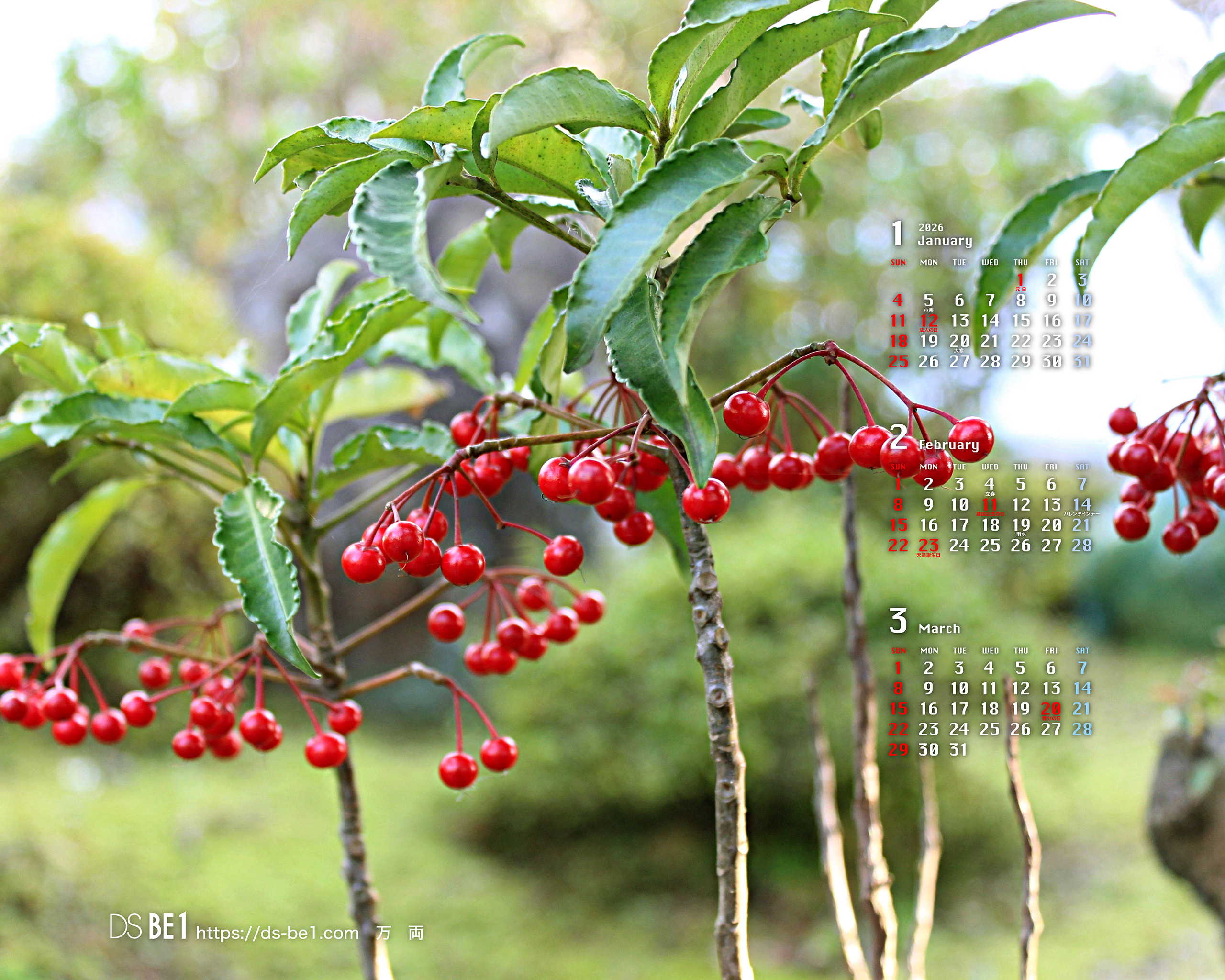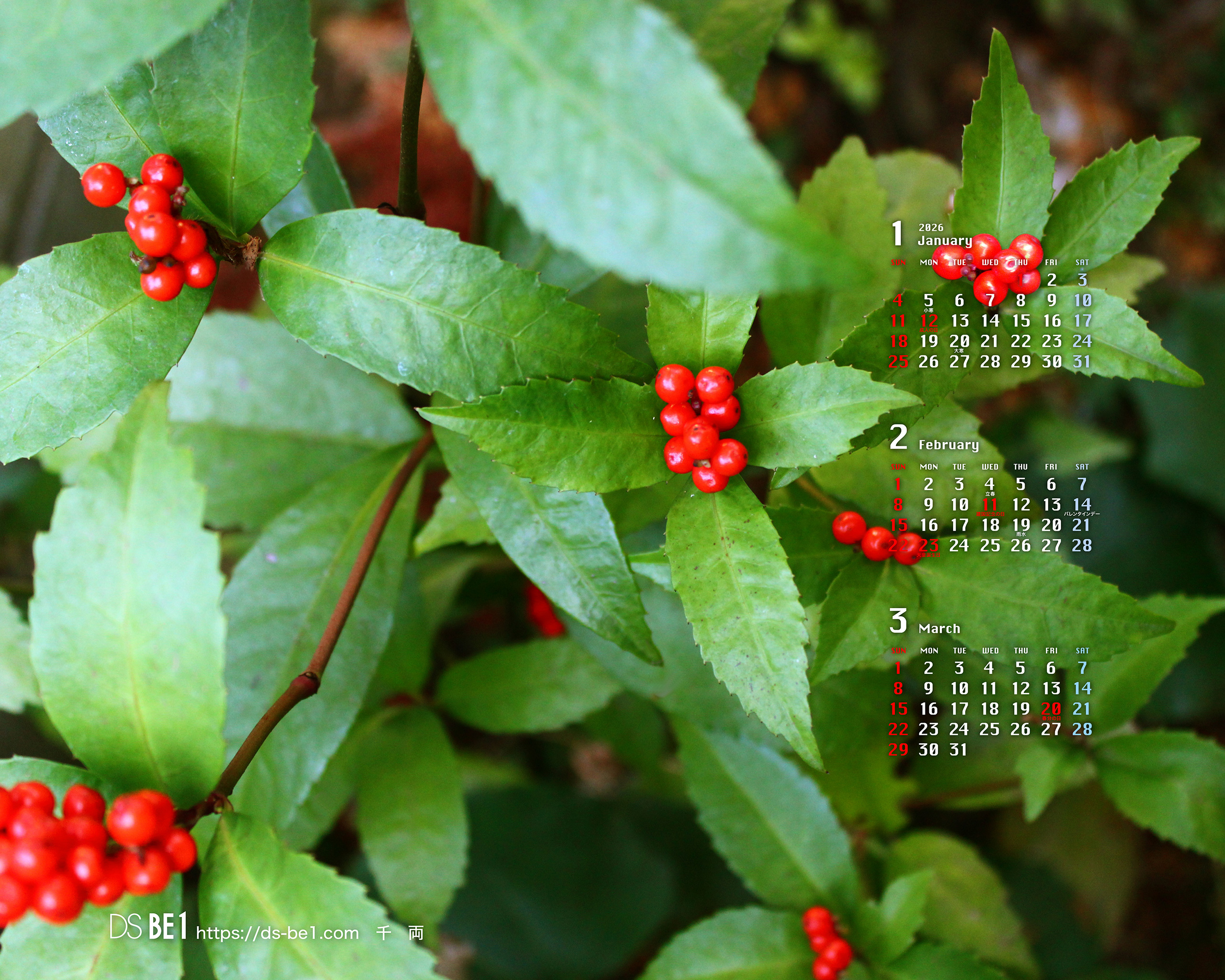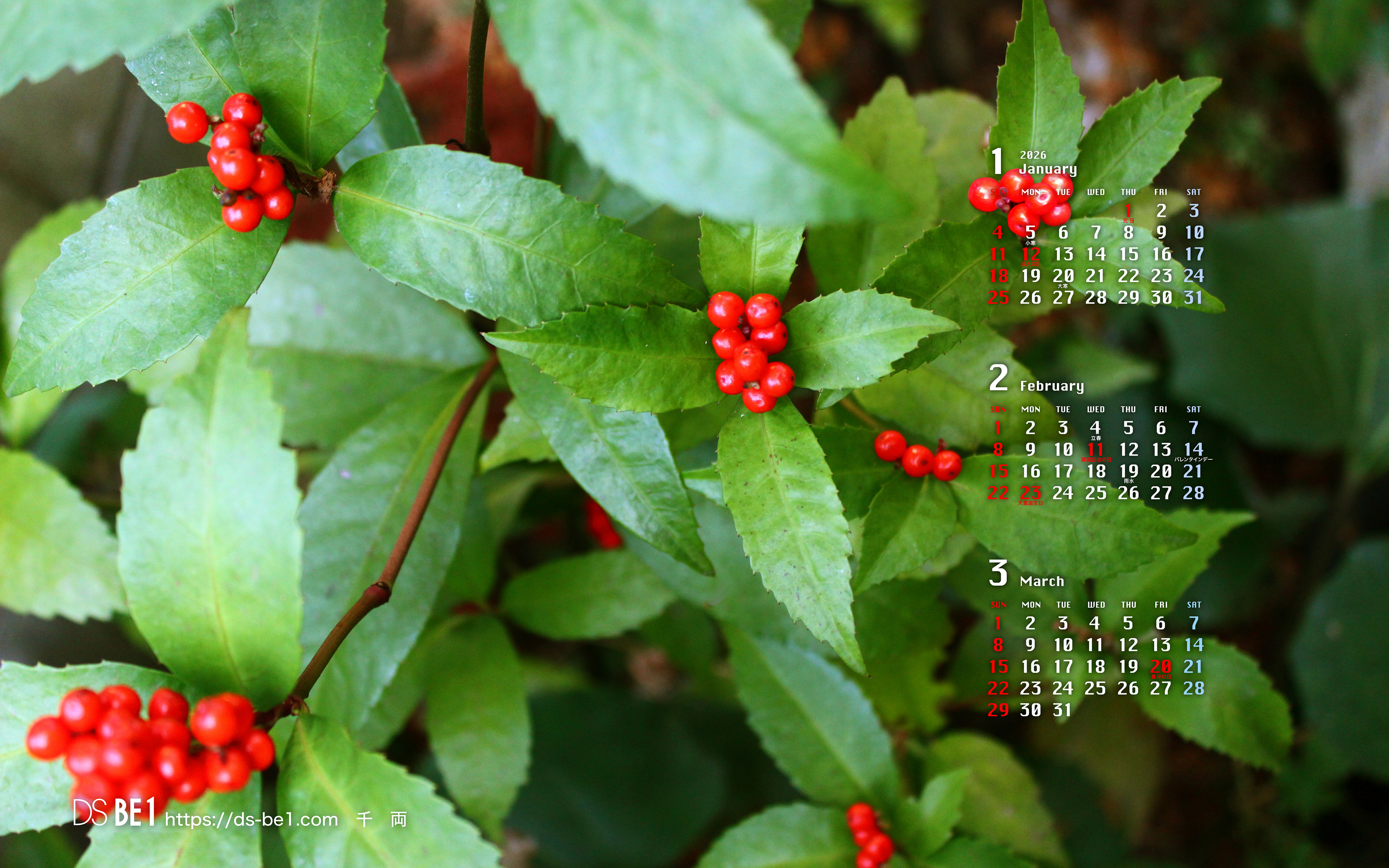山陰・鳥取県の「田舎」から自然の彩り・季節の味わいをお届けしている「壁紙カレンダー」です。季節の花・植物、風景、小動物、昆虫、果物など春夏秋冬・自然の中の彩りをカットし、壁紙およびカレンダー付きの壁紙にして毎月更新しています。パソコンの壁紙(無料)としてお楽しみください。 (※カレンダーに、万一誤りがございました場合はご容赦ください。なお、お手数ですがご一報頂ければ幸いです。)