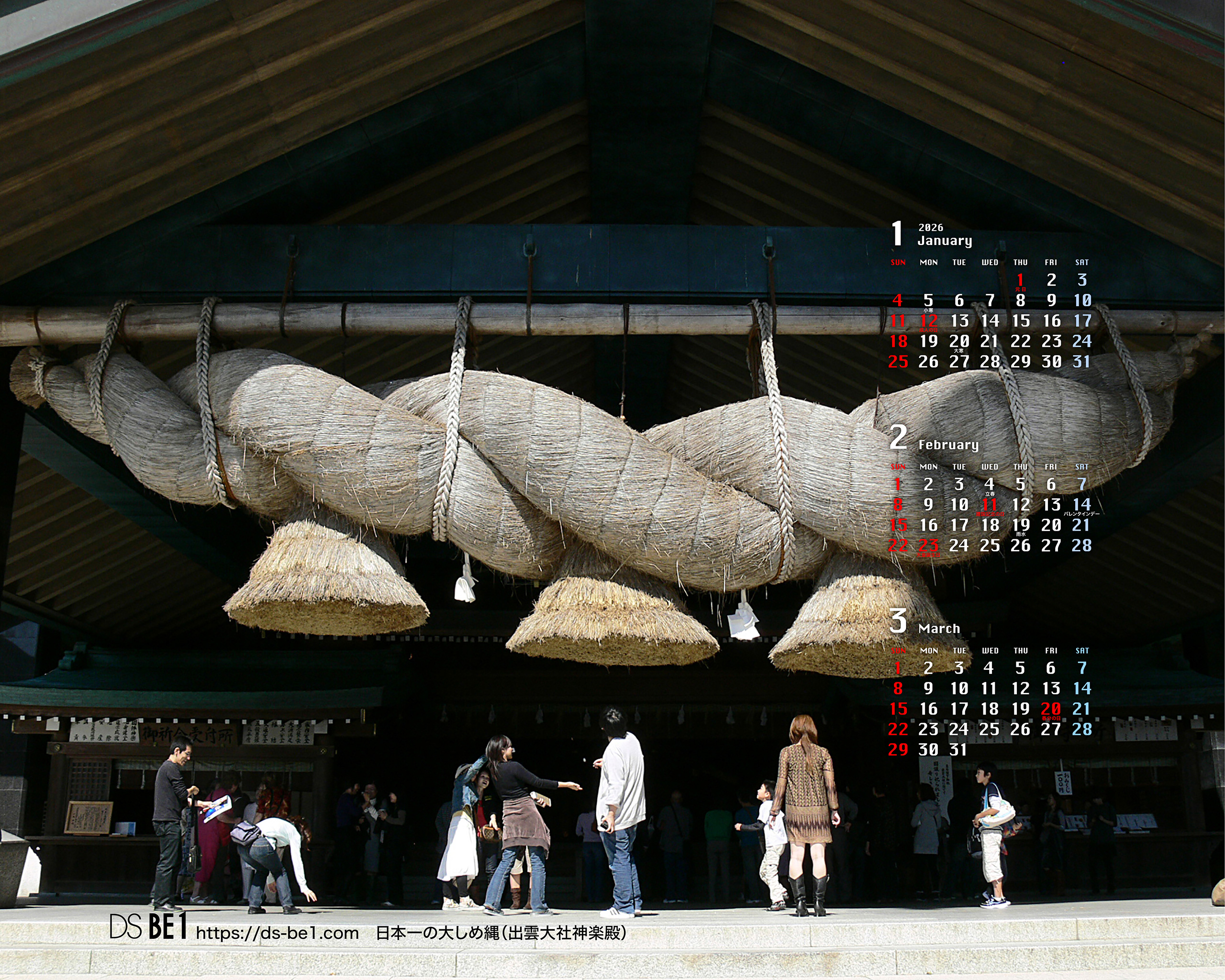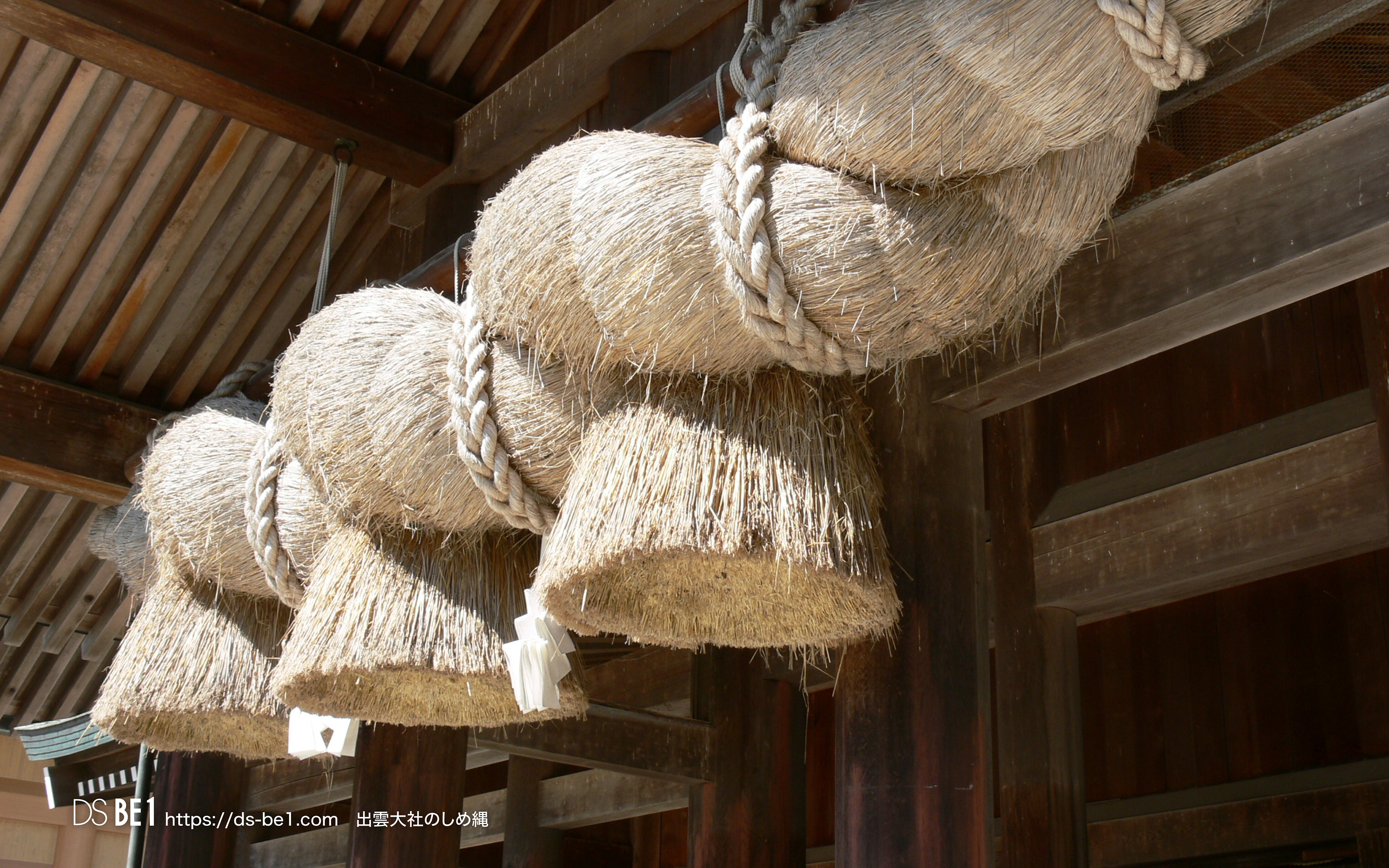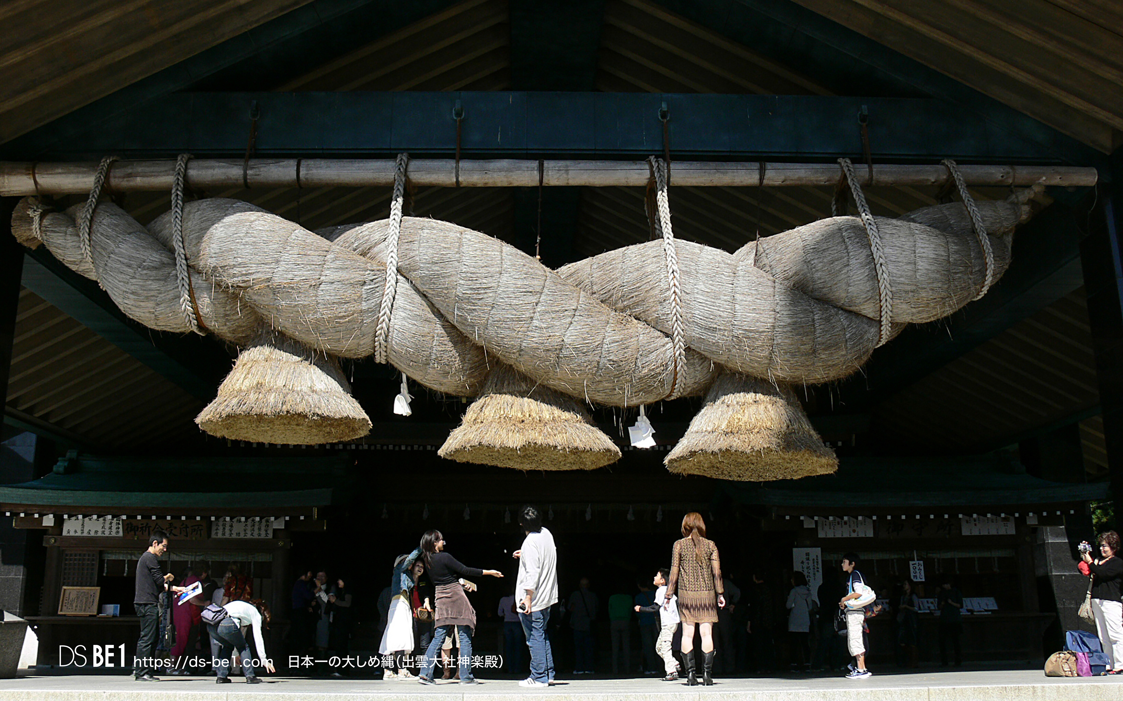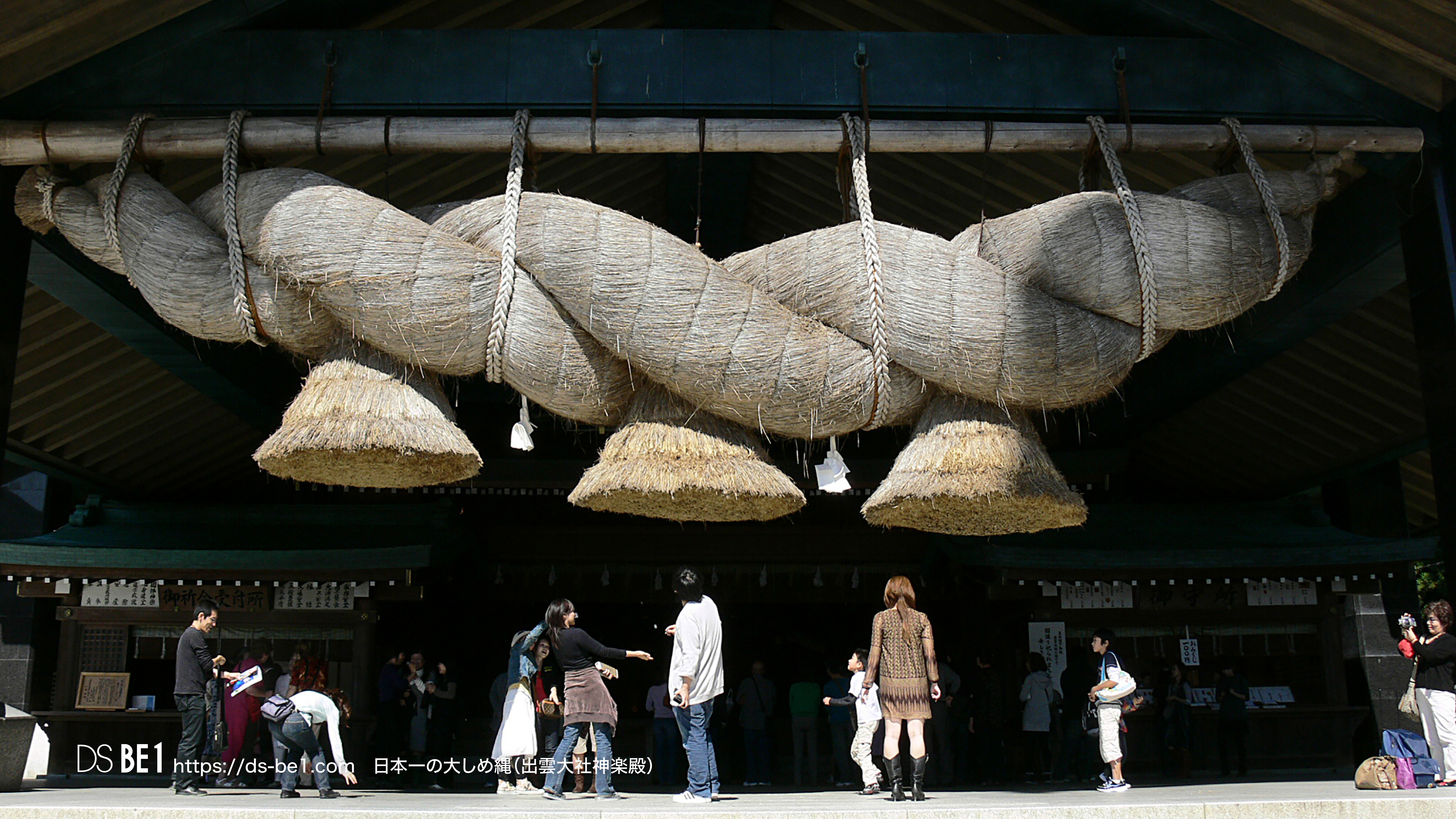 出雲大社の「大しめ縄」(おおしめなわ)は、神楽殿に吊るされた日本最大級(全長約13.6メートル、重さ約5.2トン)の巨大なしめ縄で、神域を示す結界の役割を持ち、数年ごと(約4〜8年)に島根県飯南町の「大しめなわ創作館」で1000人以上の人々が1年以上の歳月をかけて手作りされ、その大きさ(全長約13.6m、重さ約5.2t)と神聖さで有名です。しめ縄にお賽銭を投げて刺さると縁起が良いという俗説がありますが、神聖な結界を乱す行為であり、神様への失礼にあたるため絶対にやめましょう。 出雲大社「大しめ縄」制作現場